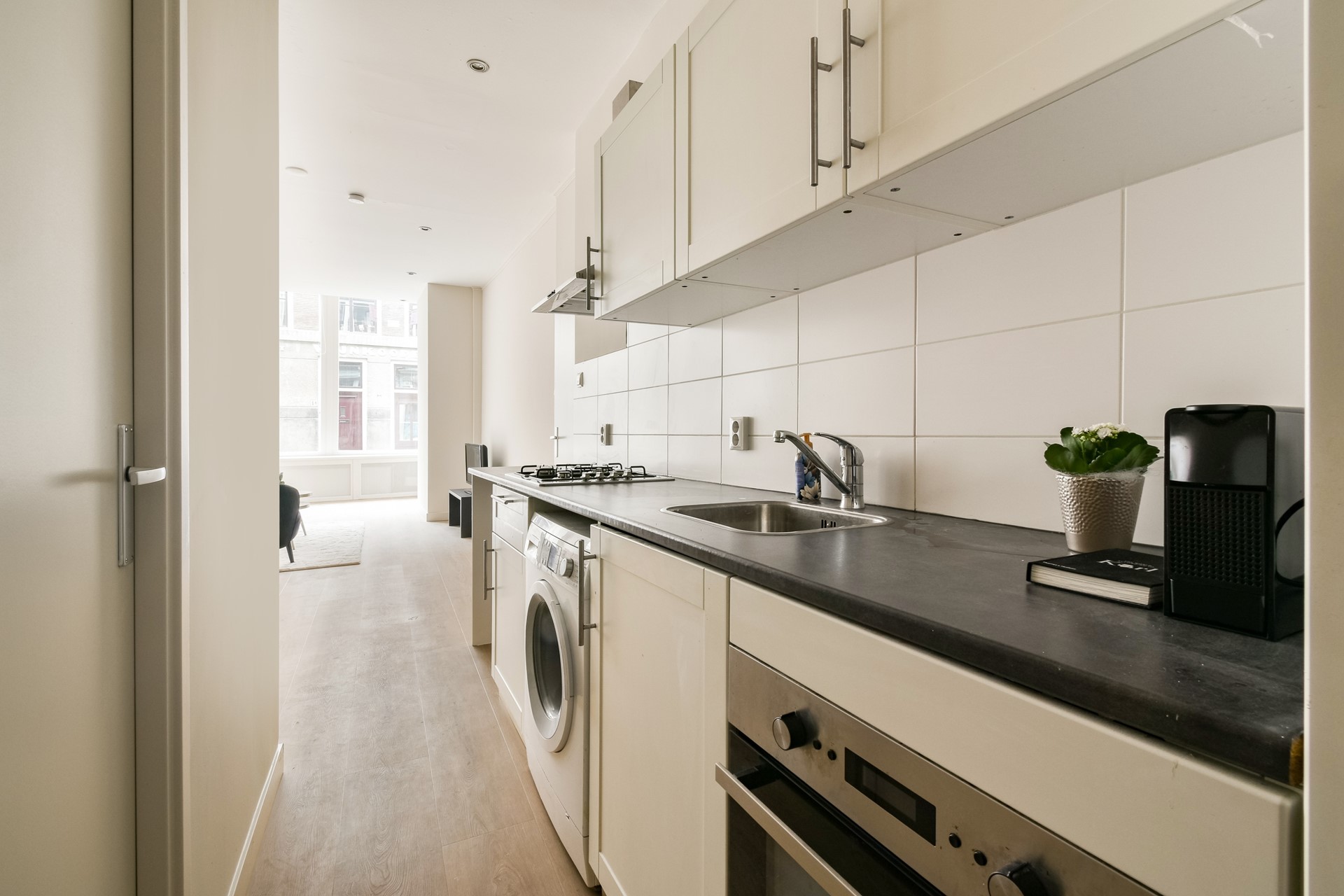 De woning is gelegen op de begane grond. Bij binnenkomst valt direct de lichte en sfeervolle woonkamer op, mede dankzij de grote raampartijen aan de voorzijde. De woonkamer biedt voldoende ruimte voor een comfortabele zithoek en eettafel en staat in open verbinding met de moderne keuken. De keuken is voorzien van diverse inbouwapparatuur