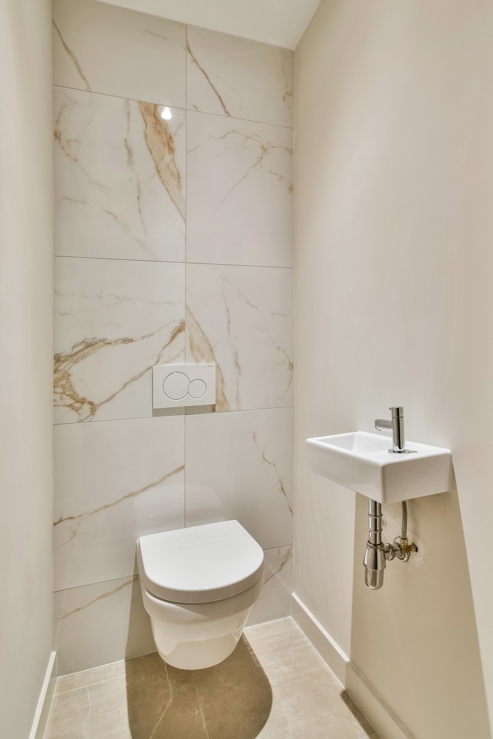 Aan de achterzijde van de woning bevindt zich de rustige slaapkamer, met directe toegang tot de luxe badkamer ensuite. Deze badkamer beschikt over een douche en een wastafel. Het toilet is separaat en bereikbaar vanuit de hal, wat zorgt voor extra comfort en privacy.